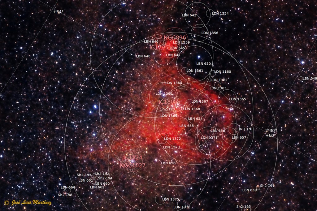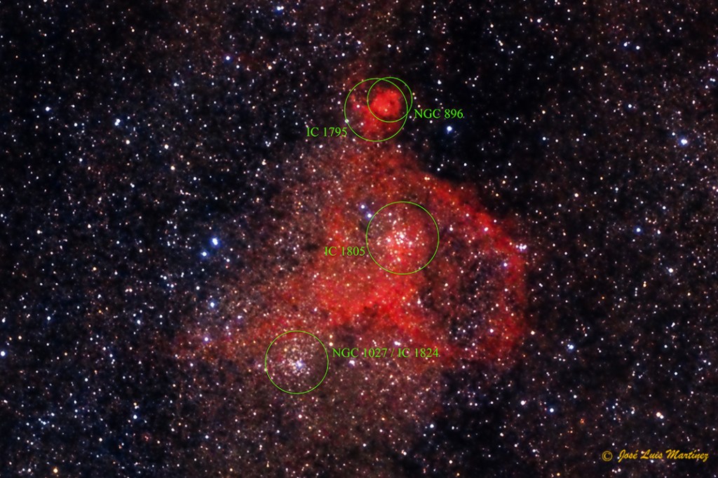 De hecho, por la parte superior de la fotografía vendrían dos nebulosas más pequeñas pero muy conocidas entre los aficionados y que también forman parte de IC 1805, la nebulosa Cabeza de pez (IC 1795) y NGC 896, la parte más brillante de la nebulosa Cabeza de pez.