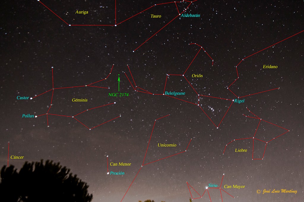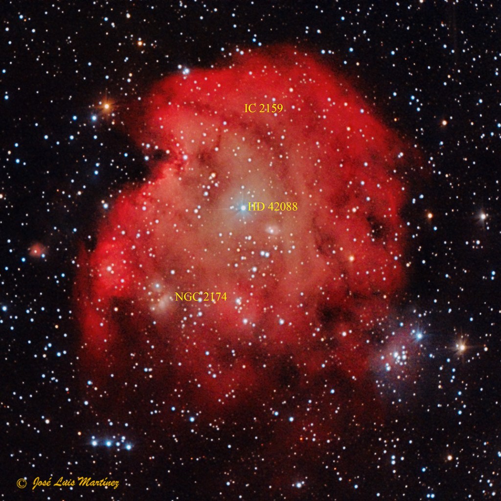 Total, en la presente entrada consideraremos que toda la región HII es el objeto NGC 2174, catalogado también como Sh2-252 e incluido también en el catálogo de Lynds como LBN 854 y el posible cúmulo abierto o grupo de estrellas disperso como NGC 2175 o Cr 84.