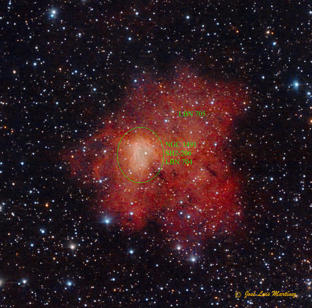 Es decir, toda la nebulosa es LBN 705 y dentro de ella, el objeto más conocido es Sh2-206 o LBN 704. Más conocido porque es lo que observamos con telescopios de aficionado. Otra cosa es lo que una fotografía de larga exposición recoge.