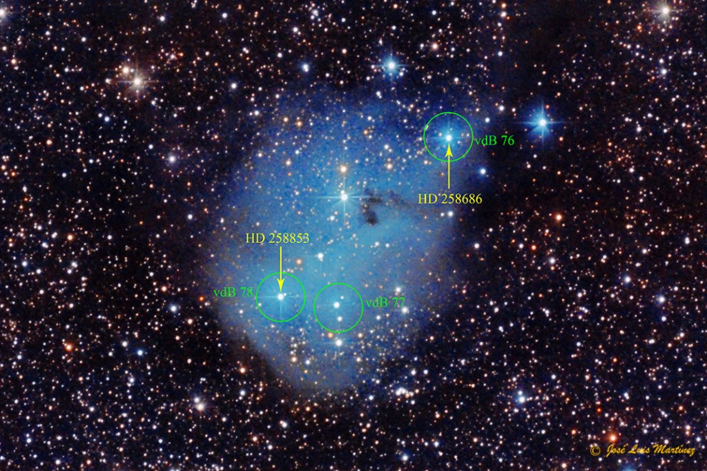 En la imagen siguiente, que es un recorte de la anterior, he señalado estas tres pequeñas nebulosas de reflexión.