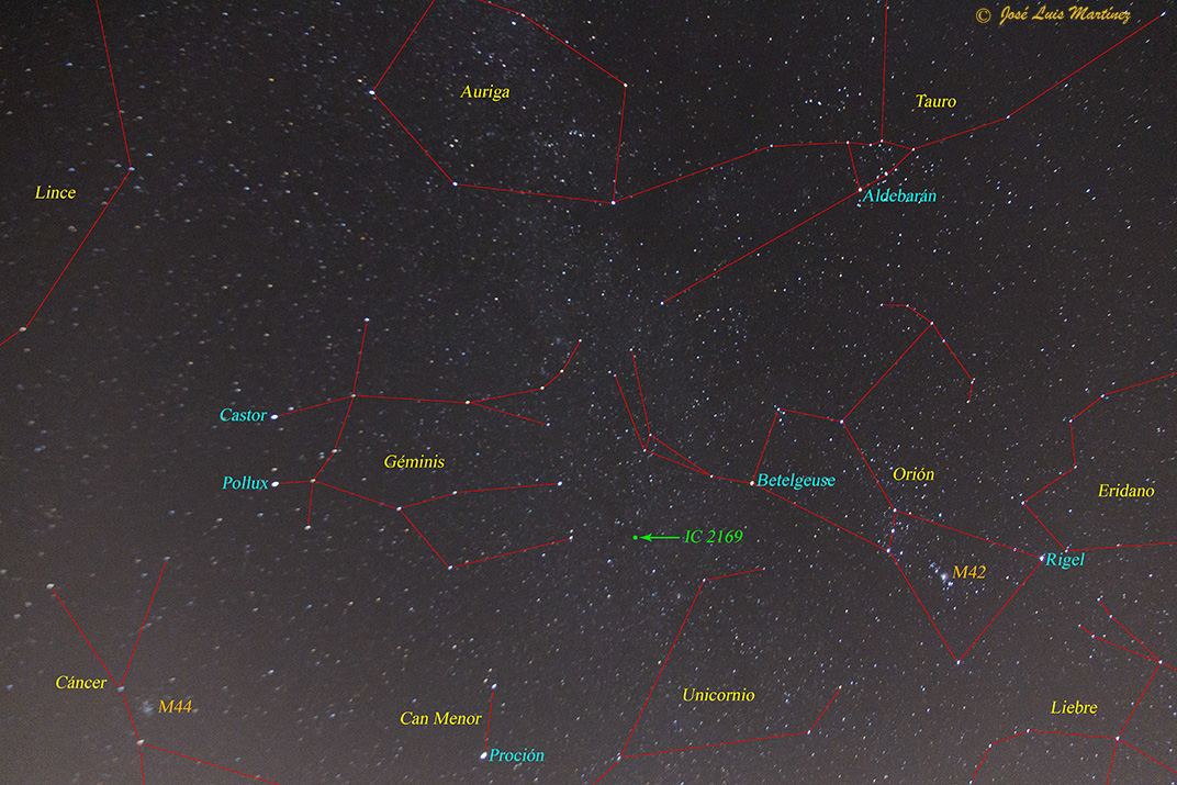 Como he indicado, esta nebulosa se encuentra en el cielo en la constelación del Unicornio, en concreto entre ésta, Géminis y Orión, a una distancia de unos 2500 años luz de nosotros. En la imagen siguiente, realizada también desde Querol y el mismo día que la anterior, pero sin telescopio, con una cámara Canon EOS 70D y un objetivo Canon 15-85, he señalado su ubicación (coordenadas ⇒ AR: 06h 30m 48s / Dec: +10º 06′).