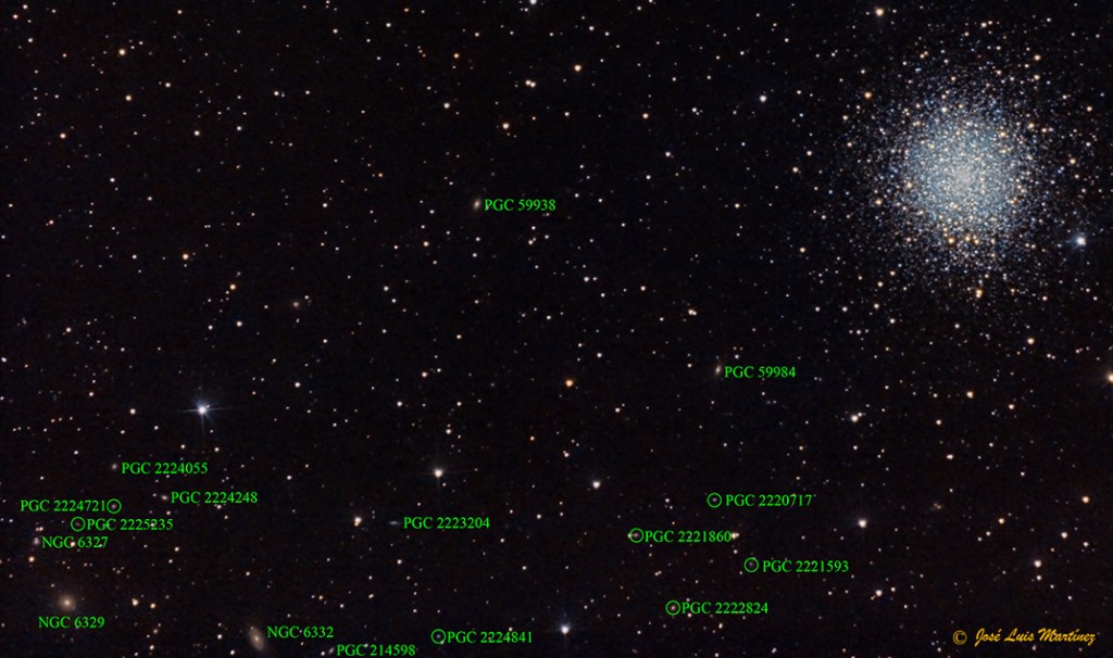 En las imágenes siguientes, que son recortes de la foto que abre el artículo, he indicado algunas. De todas ellas, las que más destacan son las galaxias elípticas NGC 6329 y NGC 6327 y la galaxia espiral NGC 6332. Las tres fueron descubiertas por el astrónomo francés Édouard Stephan en 1876.