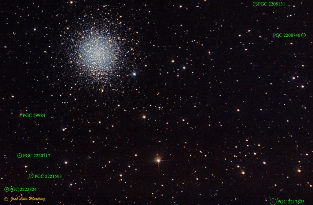 La imagen siguiente, realizada desde Querol el día 24 de junio de 2022, con un telescopio reflector Skywatcher 200/1000 y una cámara Canon EOS 550D, es de este otro gran cúmulo globular en Hércules.