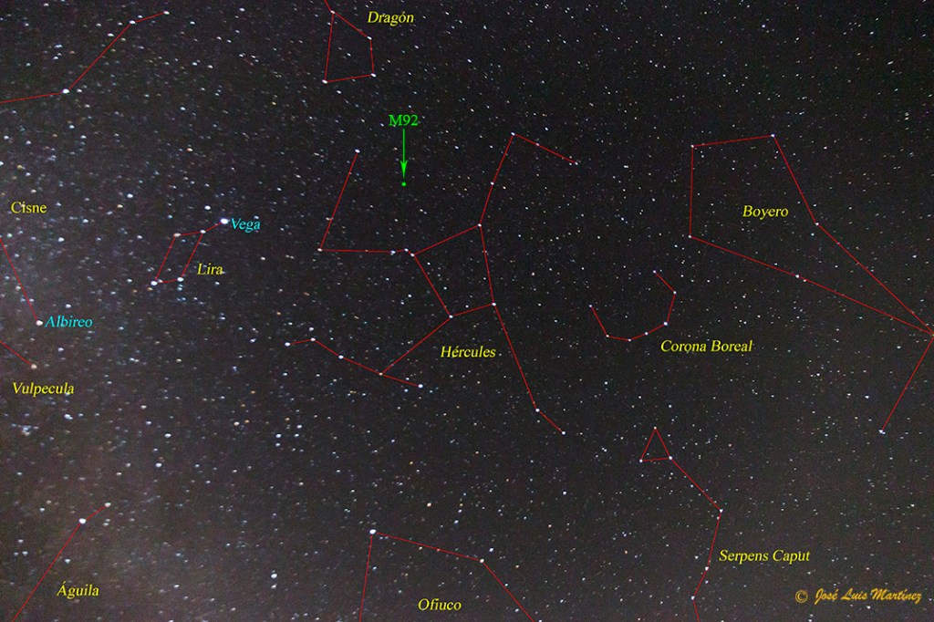 En la imagen siguiente, realizada desde Querol la misma noche que la del cúmulo, pero con una cámara Canon EOS 70D y un objetivo Canon 15-85, he indicado la ubicación en el cielo de M92 (coordenadas ⇒ AR: 17h 17m 09s / Dec: +43º 08′ 14″).