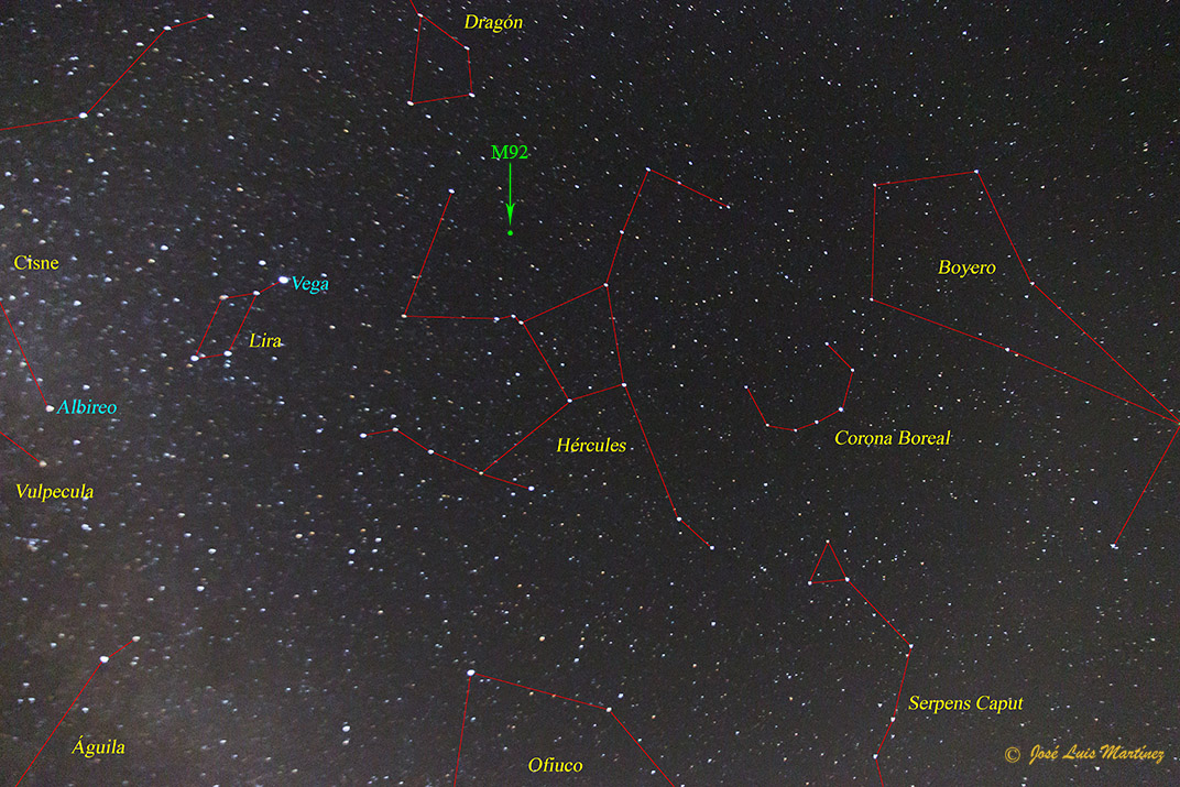 En la imagen siguiente, realizada desde Querol la misma noche que la del cúmulo, pero con una cámara Canon EOS 70D y un objetivo Canon 15-85, he indicado la ubicación en el cielo de M92 (coordenadas ⇒ AR: 17h 17m 09s / Dec: +43º 08′ 14″).
