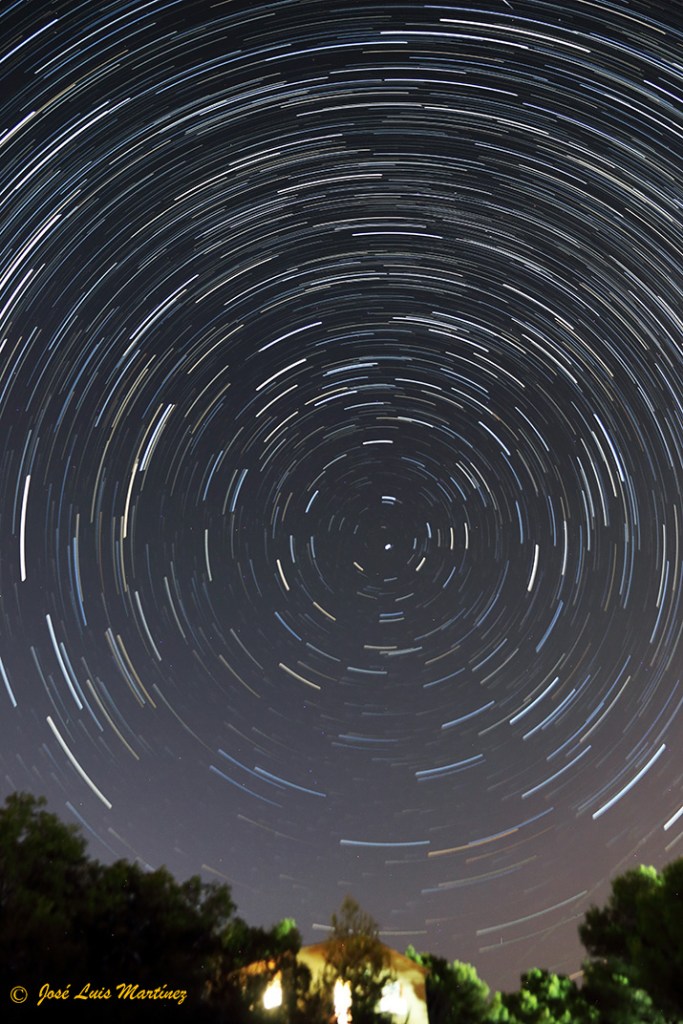 Esta fotografía es el resultado de hacer 115 tomas de 30 segundos a intervalos de 5 segundos, lo que hace un total de 67 minutos, montándolo todo con el programa Startrails. Es decir, la imagen muestra la traza que dejan las estrellas en torno a la estrella Polar durante 67 minutos. Como sabemos, no es que las estrellas giren en el cielo alrededor de la estrella Polar, sino que esto es debido a la rotación de la Tierra en torno a su eje.
