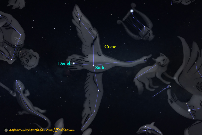 La siguiente imagen, realizada a partir del Stellarium, muestra la constelación del Cisne, su figura mitológica y sus dos estrellas más brillantes, Deneb y Sadr.
