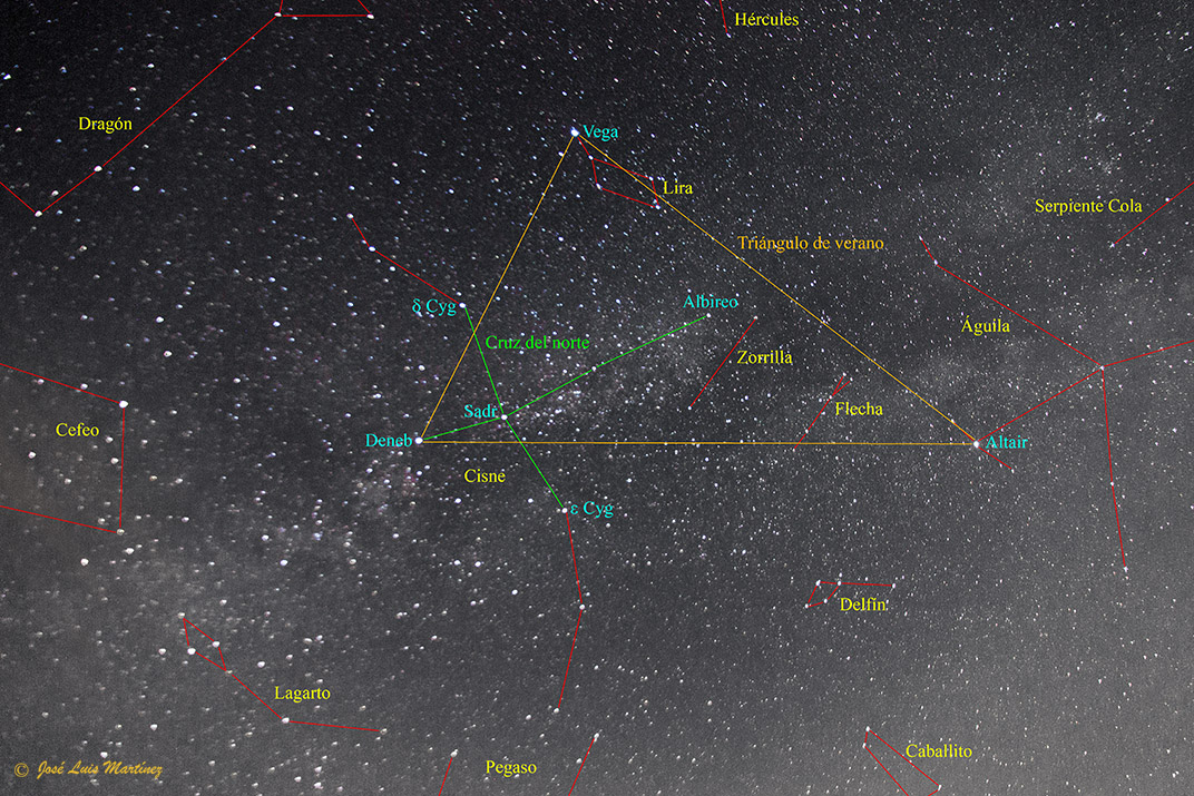 La imagen siguiente, realizada desde Querol el día 22 de julio de 2022 con una cámara Canon EOS 70D y un objetivo Canon 15-85, es de esta constelación y otras de la zona. En ella he indicado los dos asterismos mencionados, así como las estrellas que los forman. También puede observarse como la Vía Láctea atraviesa el Cisne longitudinalmente.