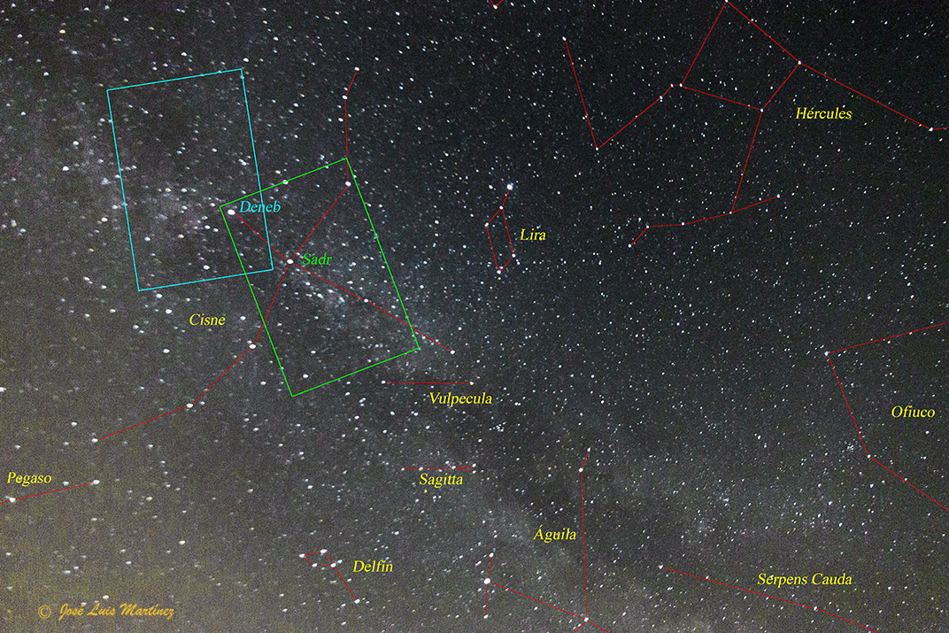 Finalmente, en la siguiente imagen de gran campo, realizada también desde Querol el día 4 de julio de 2022, pero con una cámara Canon EOS 70D y un objetivo Canon 15-85, he indicado el campo de las dos imágenes, la de la zona de Deneb y la de la zona de Sadr.