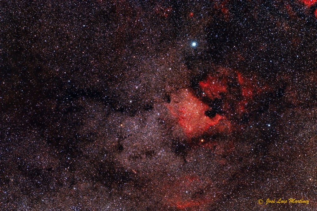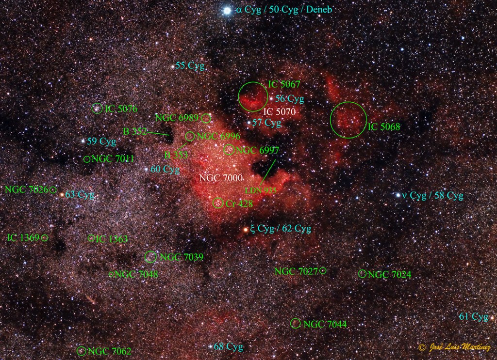 Por debajo de Deneb se observan unas nebulosas de emisión; son NGC 7000 (la nebulosa Norteamérica) e IC 5070 (la nebulosa Pelícano). En realidad es una enorme región HII que parece que sean dos debido a la nebulosa oscura, LDN 935 («Golfo de México»), que se encuentra por delante y oscurece la nebulosa de emisión. Todo este complejo se encuentra a unos 1600-2000 años luz de distancia de nosotros.