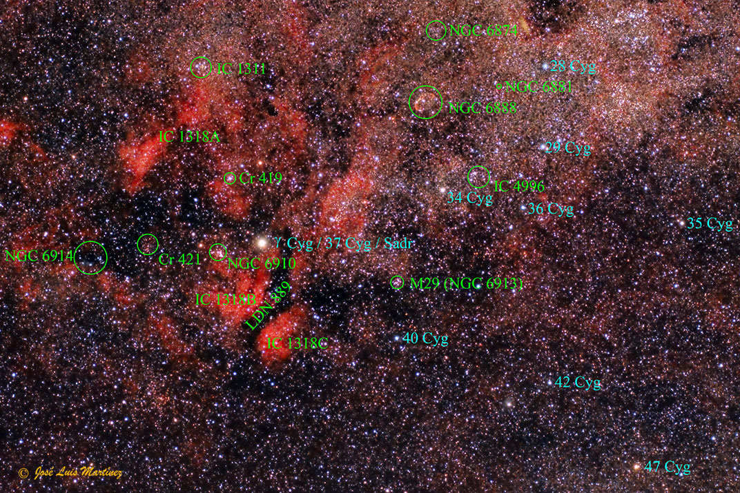 En la zona de la imagen a la derecha de Sadr y del complejo IC 1318, hay más objetos de cielo profundo, especialmente cúmulos abiertos. En esta zona está la conocida nebulosa Creciente (NGC 6888), una bonita y curiosa nebulosa de emisión situada a unos 5000 años luz de distancia de nosotros.