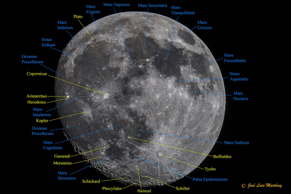 En la imagen siguiente, que es la misma que la anterior, he señalado estos cráteres y otros más, así como los mare y otras formaciones. Todos ellos están descritos en Luna gibosa creciente de 12 días.