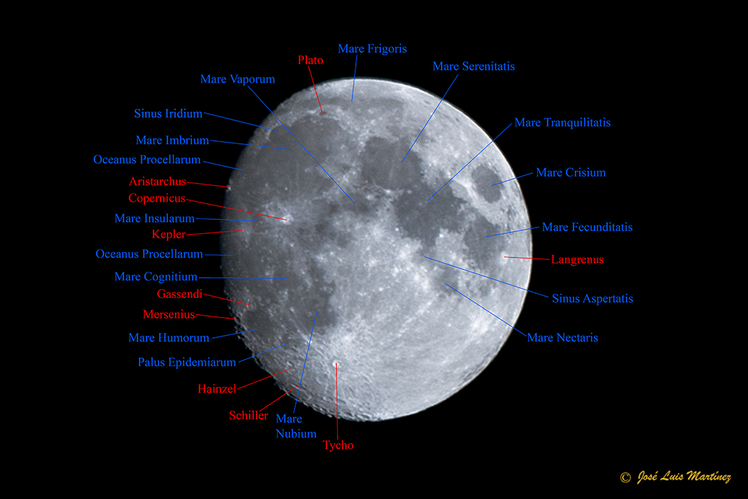 La fase es ya bastante avanzada, por lo que se pueden ver todos los mare y algunos cráteres, especialmente los tres más emblemáticos, Plato en el norte, Copernicus en el centro y Tycho en el sur. También se ven, pero menos, Kepler, al sudoeste de Copernicus y empieza a asomar por el oeste el faro de la Luna, es decir, el cráter Aristarchus.