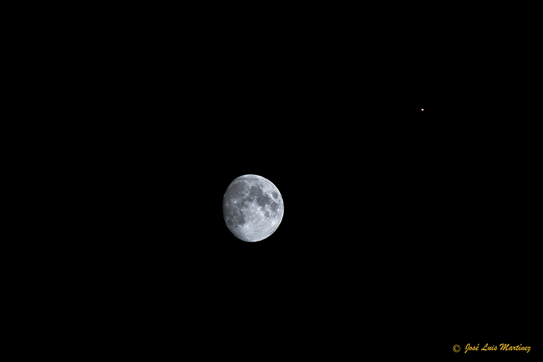 Marte es el puntito que se ve a la derecha y arriba de la Luna. En realidad son dos fotografías unidas, una con la Luna sin quemar para que se vean los detalles de la misma y otra con la Luna quemada, para que se vea Marte, ambas a una distancia focal de 200 mm,