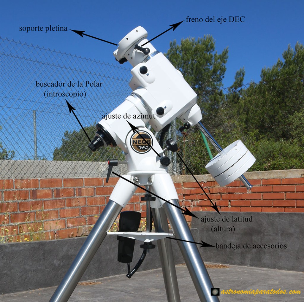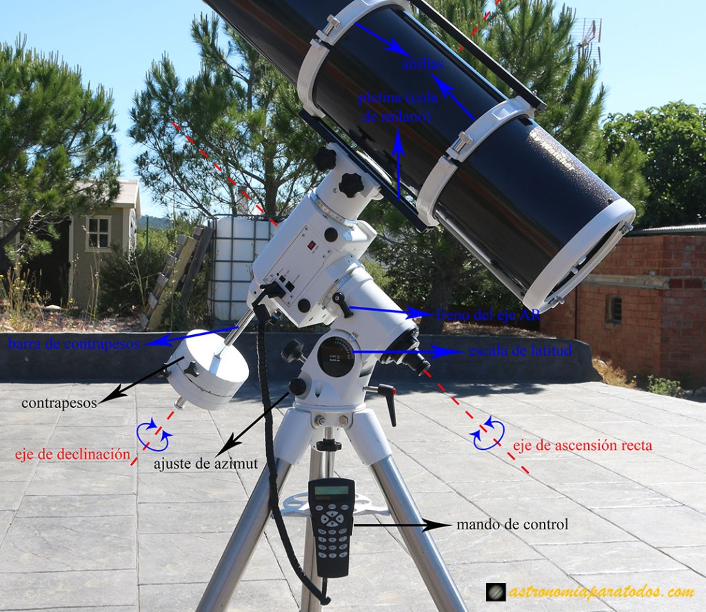 Las monturas ecuatoriales tienen una serie de elementos que he señalado en las dos siguientes imágenes, que son de la montura que utilizo para cielo profundo.