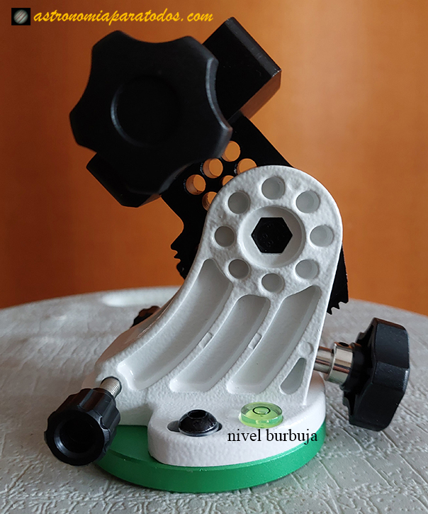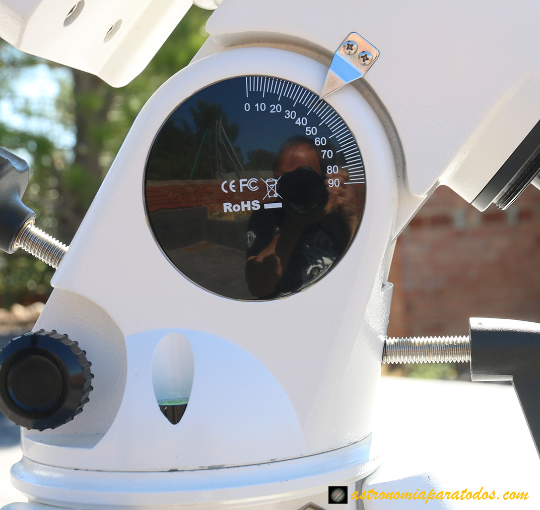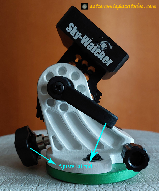 La montura ecuatorial, además de los movimientos en ascensión recta y declinación, también la podemos mover en altura y azimut. Es precisamente ajustando la altura (latitud, que la podemos ajustar primero a ojo mediante el círculo de la escala de latitud) y el azimut, como pondremos en estación nuestro equipo.