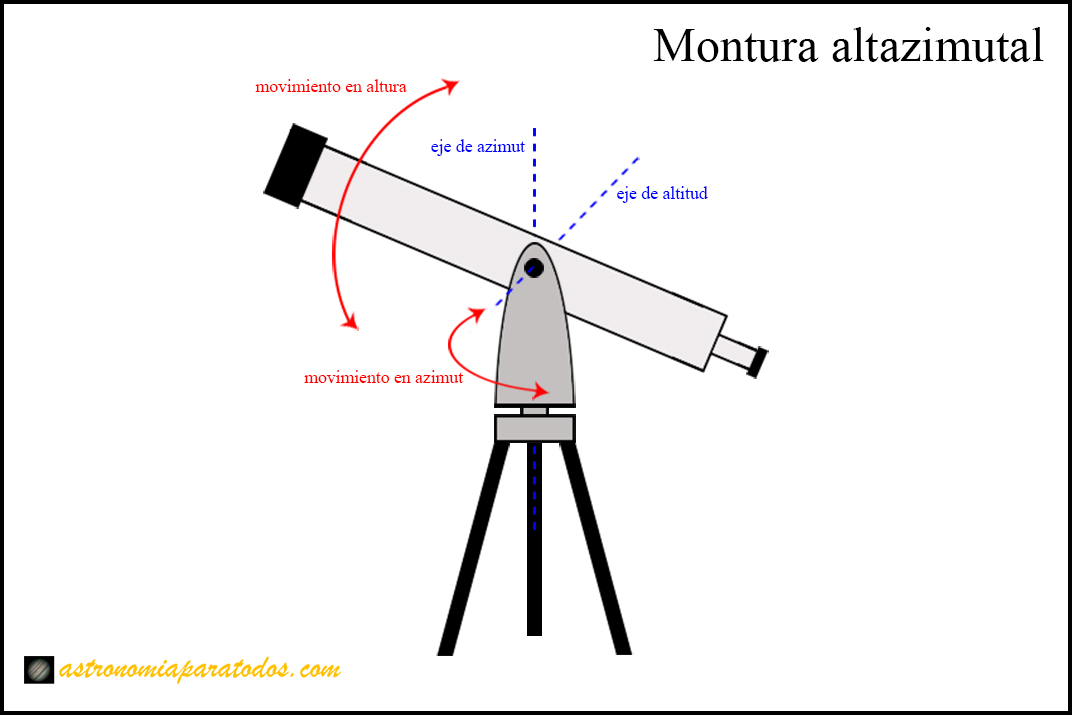 Las monturas altazimutales son las más sencillas. Tienen un eje vertical o de azimut (o acimut, ambos términos son correctos), que nos permitirá hacer movimientos horizontales (en azimut) y un eje horizontal o de altitud, que nos permitirá hacer movimientos verticales (en altura).