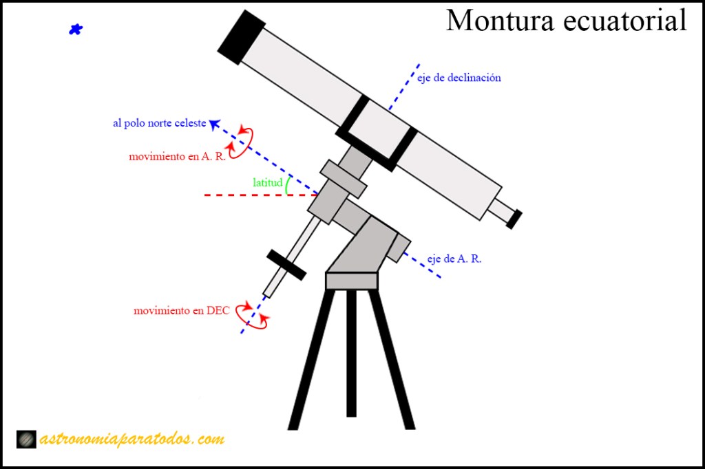 La montura ecuatorial tiene un eje, el eje de Ascensión Recta (AR o también RA), paralelo al eje de rotación de la Tierra, por lo que podremos compensar el movimiento de rotación terrestre y, por tanto, seguir el movimiento de los astros en la esfera celeste, moviendo únicamente este eje AR. Esto hace que la montura ecuatorial sea la más utilizada.