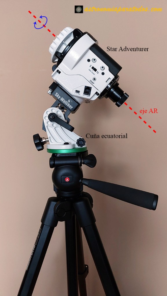 Esta cuña se monta sobre un trípode de fotografía, cuanto más robusto mejor, y tiene un soporte para cola de milano donde se acopla la Star Advenurer. Ésta es una montura motorizada en un único eje, el cual, una vez montada la Star Adventurer sobre la cuña, es el de ascensión recta.