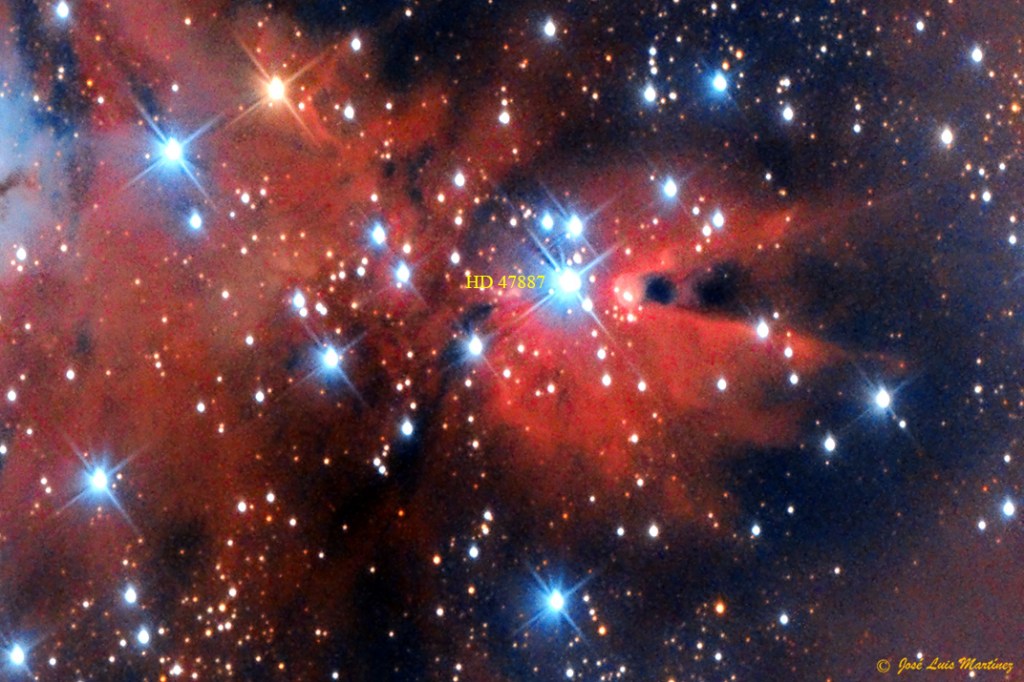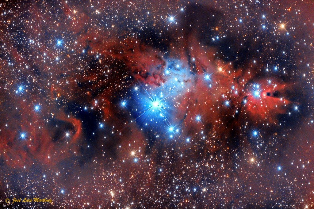 Con un diámetro de unos 30 años luz y a una distancia de nosotros de unos 2600 años luz, esta región está catalogada en conjunto como NGC 2264 y se conoce como el cúmulo del árbol de Navidad y la nebulosa del Cono.
