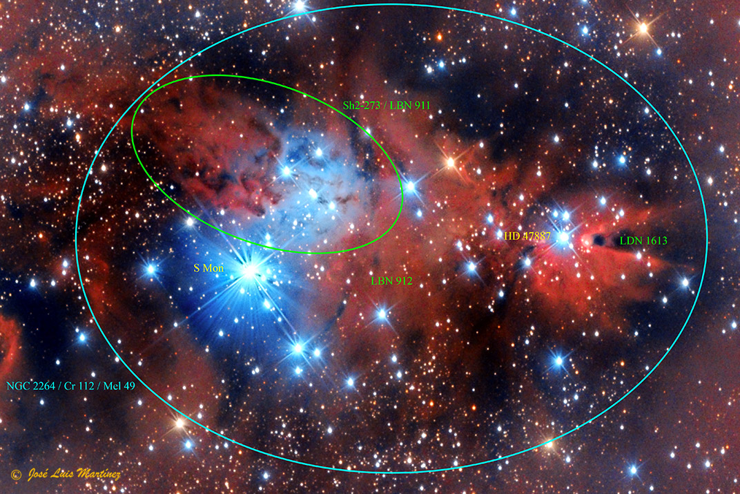 Por lo que he podido deducir leyendo en diversas fuentes, en donde he encontrado más unanimidad sería como sigue: todo el complejo es NGC 2264; el cúmulo abierto árbol de Navidad, cuyas dos estrellas más brillantes se sitúan en ambos extremos del mismo (15 Monocerotis ⇒ 15 Mon o también catalogada como S Monocerotis ⇒ S Mon, en la base y HD 47887 en la cúspide), está tanto en el catálogo Collinder (Cr 112) como en el Melotte (Mel 49); la nebulosa roja de emisión que envuelve todo el cúmulo es LBN 912; junto a la estrella 15 Monocerotis hay una nebulosa roja de emisión y otra colindante azul de reflexión, ambas de una apariencia o textura particular, es la catalogada como Sh2-273 (o también LBN 911) y conocida como la nebulosa de la Piel de Zorro; finalmente, en la cúspide del «árbol» hay una nebulosa circular rojiza de emisión en la que se observa, por contraste, una nebulosa oscura triangular (cónica), la conocida como nebulosa del Cono y catalogada como LDN 1613.
