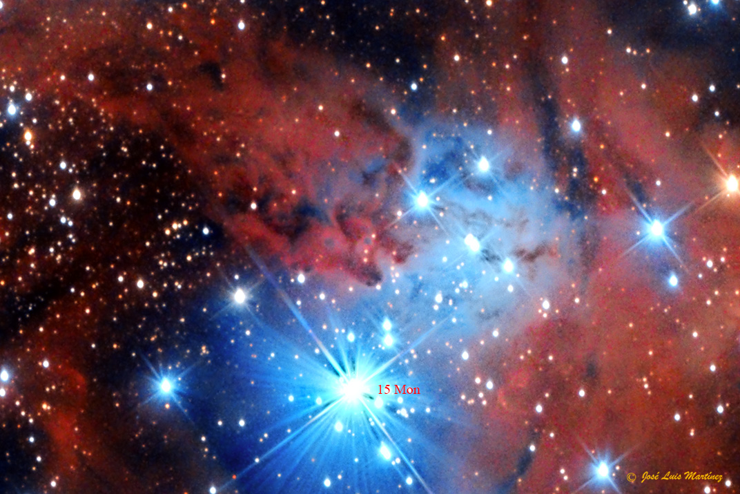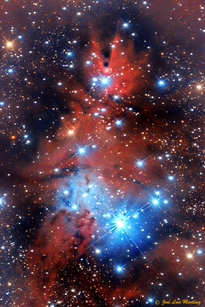 Con un diámetro de unos 30 años luz y a una distancia de nosotros de unos 2600 años luz, esta región está catalogada en conjunto como NGC 2264 y se conoce como el cúmulo del árbol de Navidad y la nebulosa del Cono.