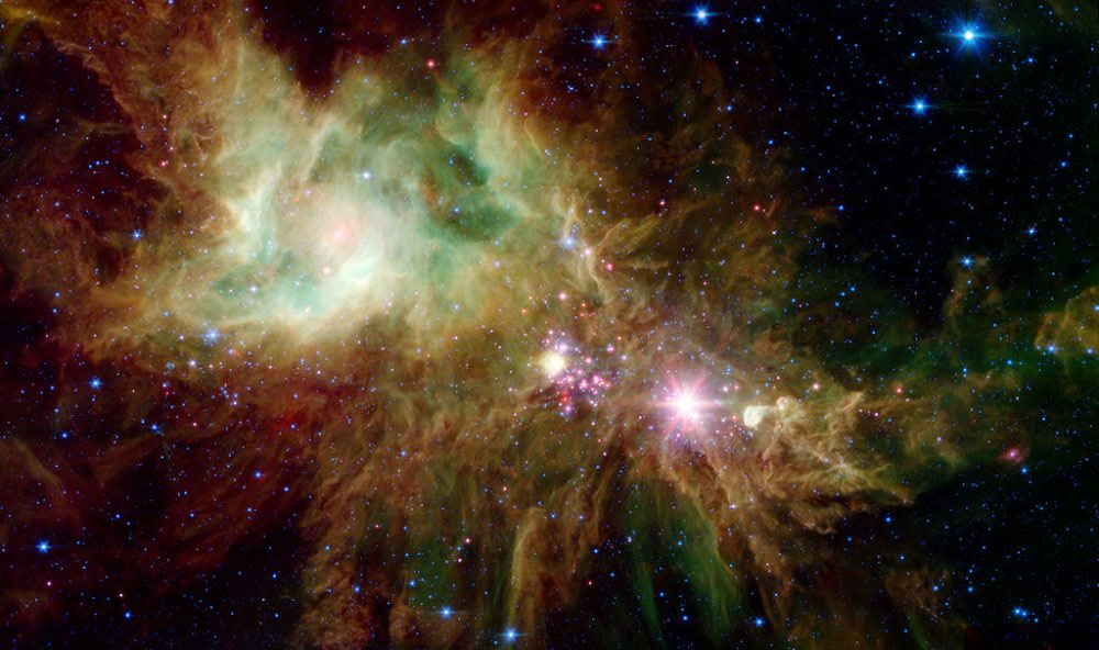 Las estrellas del cúmulo árbol de Navidad expulsan gas y producen vientos estelares que colisionan con el polvo y gas de la nebulosa, produciendo una zona de turbulencias que le da esta textura especial.