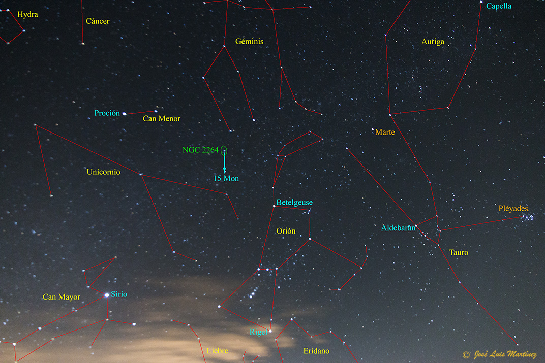 En la siguiente imagen, realizada también desde Querol y el mismo día (mientras hacía la foto de NGC 2264), con una cámara Canon EOS 70D y un objetivo Canon 15-85, he señalado su ubicación en el cielo (coordenadas ⇒ AR: 06h 40m / Dec: +09º 53′ 40″).