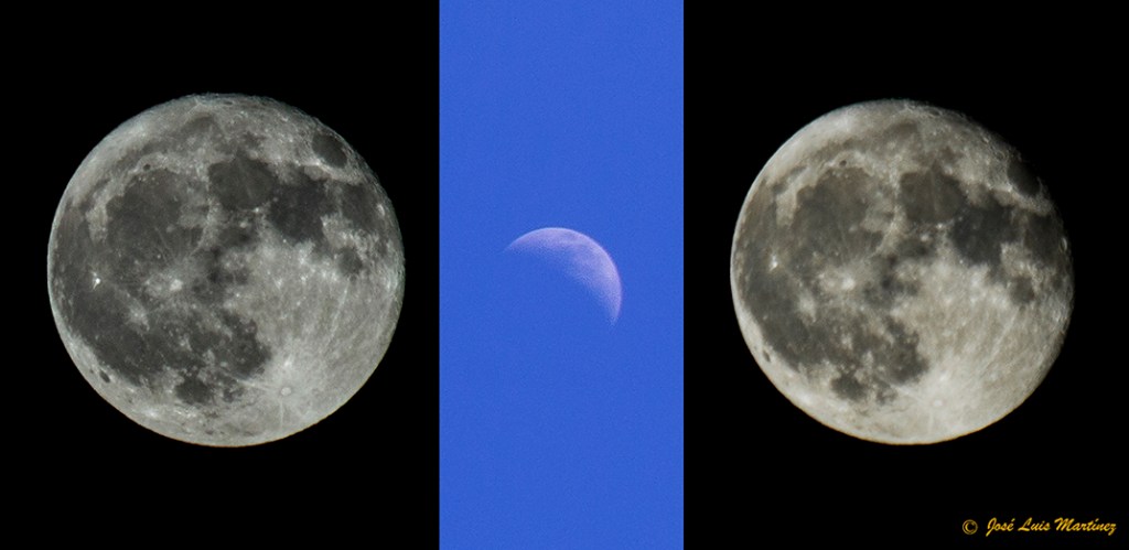 Los días 4 y 24 de junio y 4 de julio de 2023, le hice unas fotos a la Luna, todas ellas sin telescopio, con la Canon EOS 70D y los objetivos Canon 15-85 y 70-300; las de los dos días de junio desde Querol (Tarragona) y la del 4 de julio desde Cornellà de Llobregat (Barcelona).