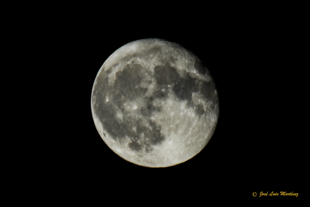 El martes 4 de julio de 2023 la Luna estaba gibosa menguante, con una edad de 16 días (un día después de llena) y un 98% de iluminación. Me encontraba en Cornellà de Llobregat, con un cielo claro y sin nubes. Pero para no subir al terrado con el telescopio y todos sus artilugios, lo hice con la réflex, el 70-300 y el trípode, realizando la siguiente fotografía de nuestro satélite con una distancia focal de 300 mm.
