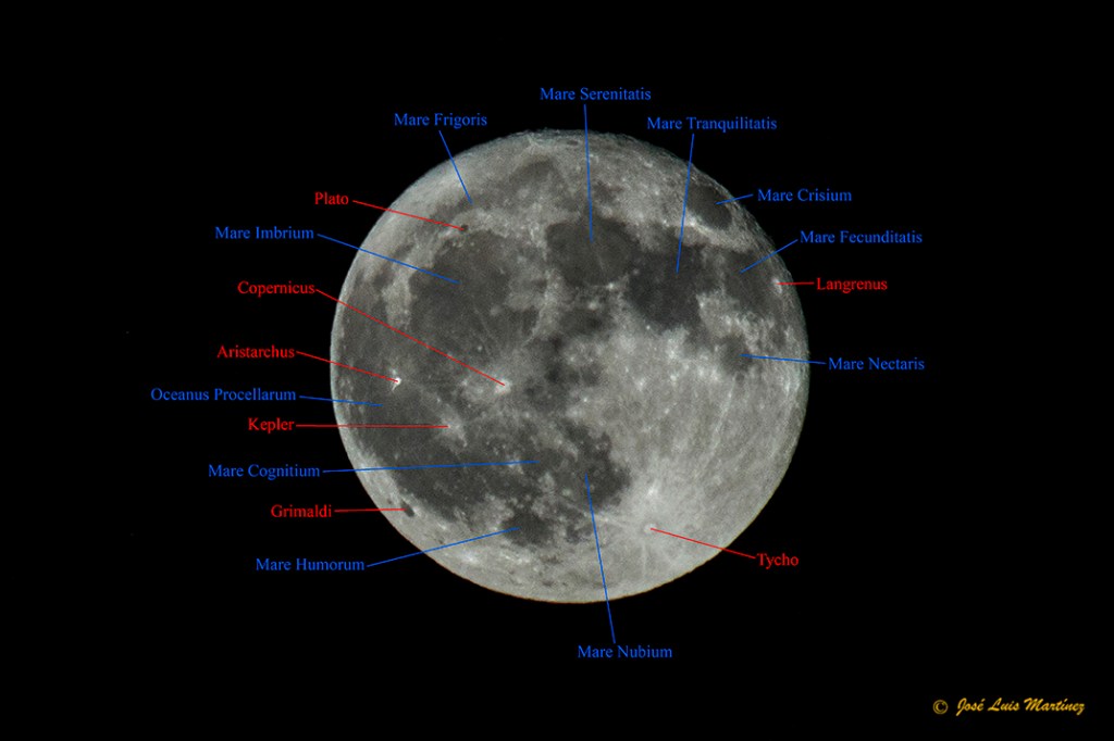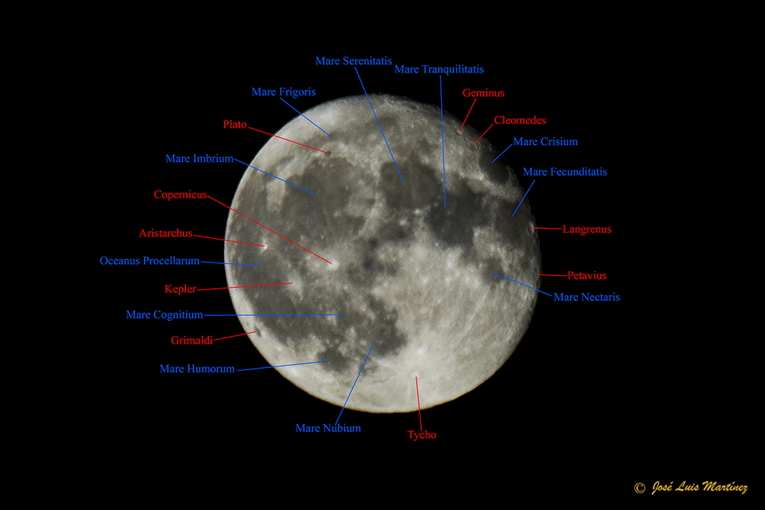 En la siguiente imagen, que es la misma que la anterior, he anotado las formaciones más importantes que pueden observarse en luna llena.