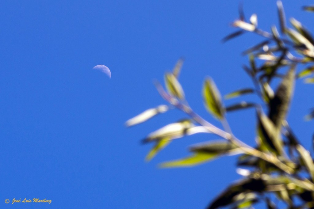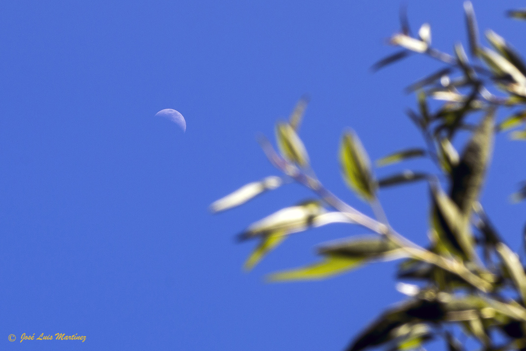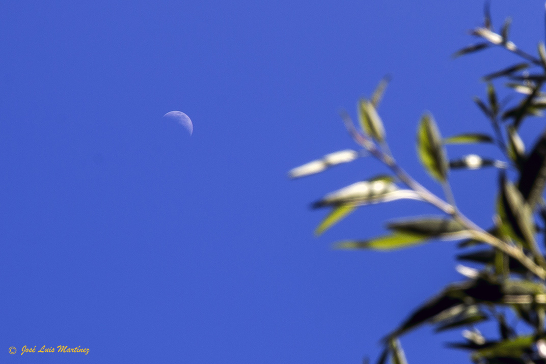 Durante el día el cielo prometía, por lo que mientras atardecía estuve montando el telescopio. Pero antes hice estas dos fotografías de la Luna de día con la réflex y el 15-85 en la de la izquierda (85 mm de distancia focal) y el 70-300 en la de la derecha (90 mm de distancia focal).