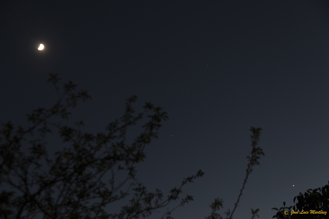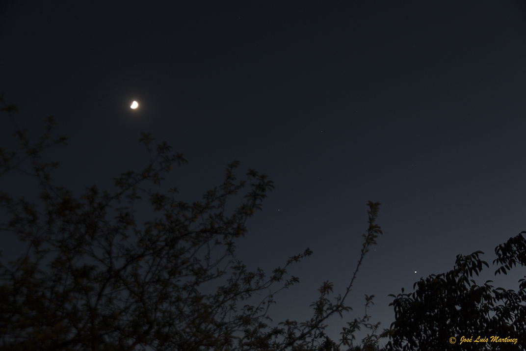La Luna está claro. Venus es el punto brillante abajo y a la derecha de las imágenes. Marte es el puntito que se ve un poco por encima y un poco a la izquierda de Venus, justo antes de llegar a la siguiente rama del árbol. Si seguimos hacia la izquierda la línea Venus-Marte, llegamos a otro puntito casi en el centro de las imágenes (un poco hacia abajo) y justo antes de otra rama del árbol; es Regulus, la estrella más brillante de la constelación de Leo. Finalmente, si seguimos hacia la izquierda la línea de estos tres astros, llegamos a la Luna.