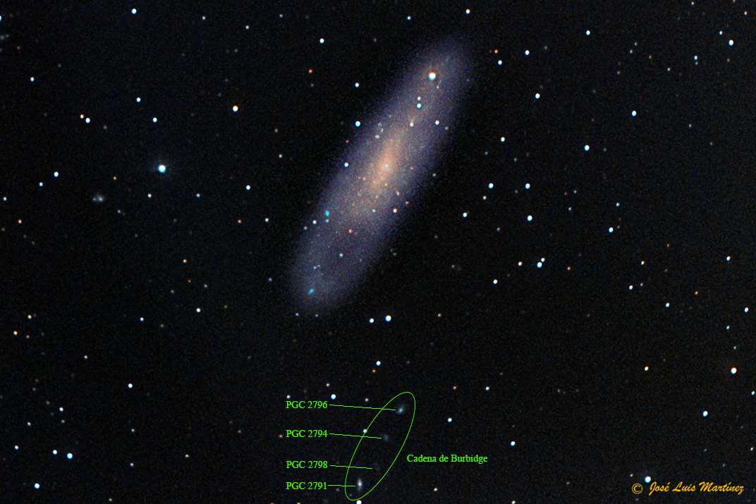 De hecho, en el mismo campo de la imagen, hay multitud de galaxias bastante más pequeñas. Pero no es que sean más pequeñas, sino que están bastante más lejos (a varios cientos de millones de años luz de distancia) y, por ello, se ven más pequeñas. De entre ellas destaca una cadena de cuatro galaxias, la cadena de Burbidge, las cuales están a una distancia de nosotros de unos 300 millones de años luz y están catalogadas como PGC 2791, 2794, 2796 y 2798.