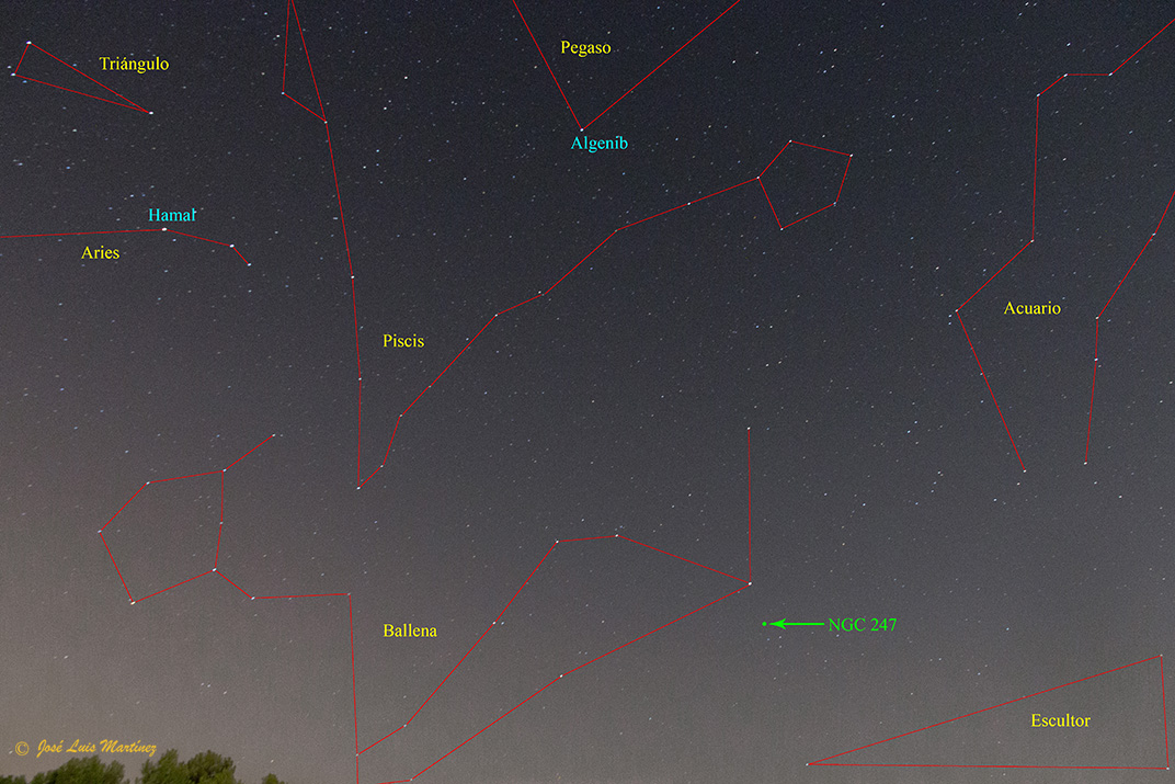 Como ya he indicado, NGC 247, la galaxia Ojo de la aguja, se encuentra en el cielo en la constelación de la Ballena. En la imagen siguiente, realizada también desde Querol pero el día 7 de septiembre de 2019 y con una cámara Canon EOS 70D y un objetivo Canon 15-85, he indicado su ubicación (coordenadas ⇒ AR: 0h 47m 09s / Dec: -20º 45′ 36″).