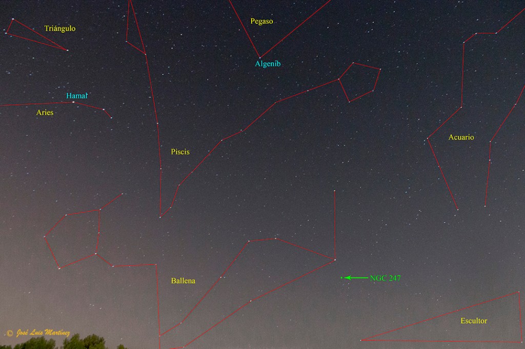 Localización en el cielo de NGC 247, la galaxia Ojo de la aguja
