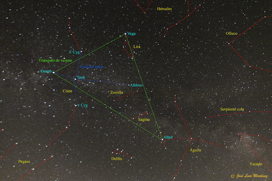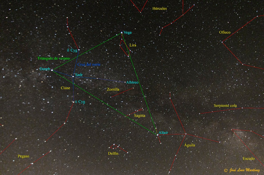 El Triángulo de verano es un asterismo en forma de triángulo (de ahí su nombre), cuyos vértices son las estrellas más brillantes de tres constelaciones muy características del verano boreal: Deneb del Cisne, Vega de la Lira y Altair del Águila. Por otro lado, la Cruz del norte tiene forma de cruz (de ahí también su nombre 😊) y está formada por las cinco estrellas más brillantes de la constelación del Cisne: Deneb (α Cyg, alpha Cygni), Sadr (γ Cyg, gamma Cygni), ε Cyg (epsilon Cygni), δ Cyg (delta Cygni) y Albireo (β Cyg, beta Cygni). La barra larga de la cruz va de Deneb a Albireo y la corta de ε Cyg a δ Cyg; ambas se cruzan en Sadr.