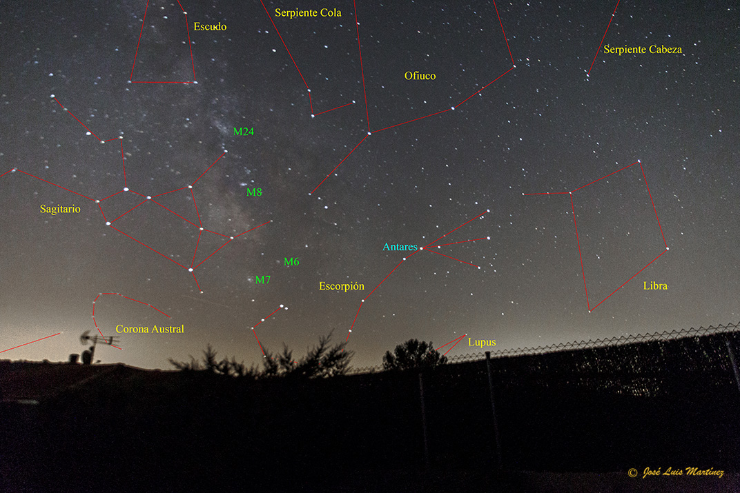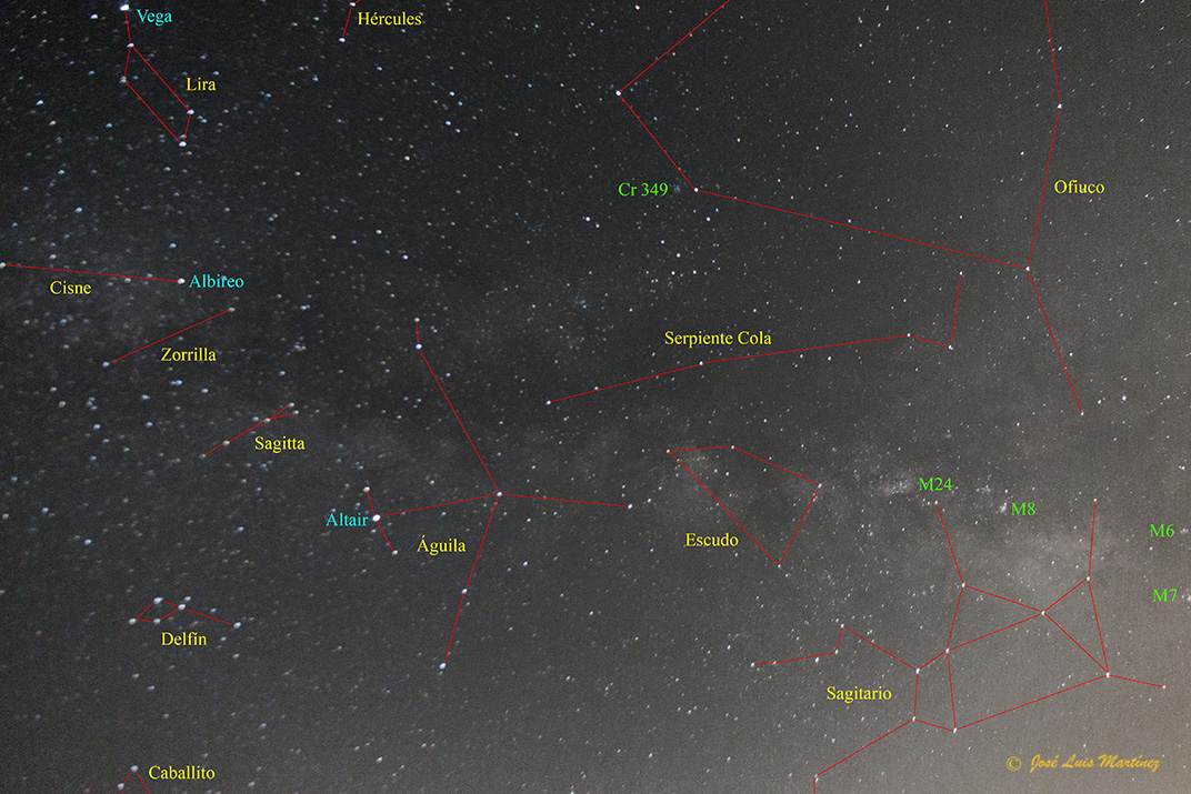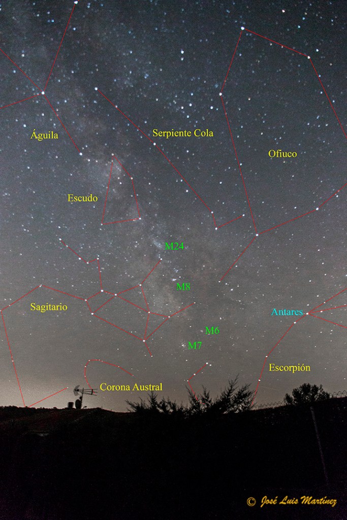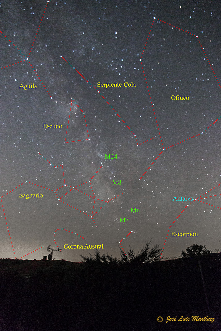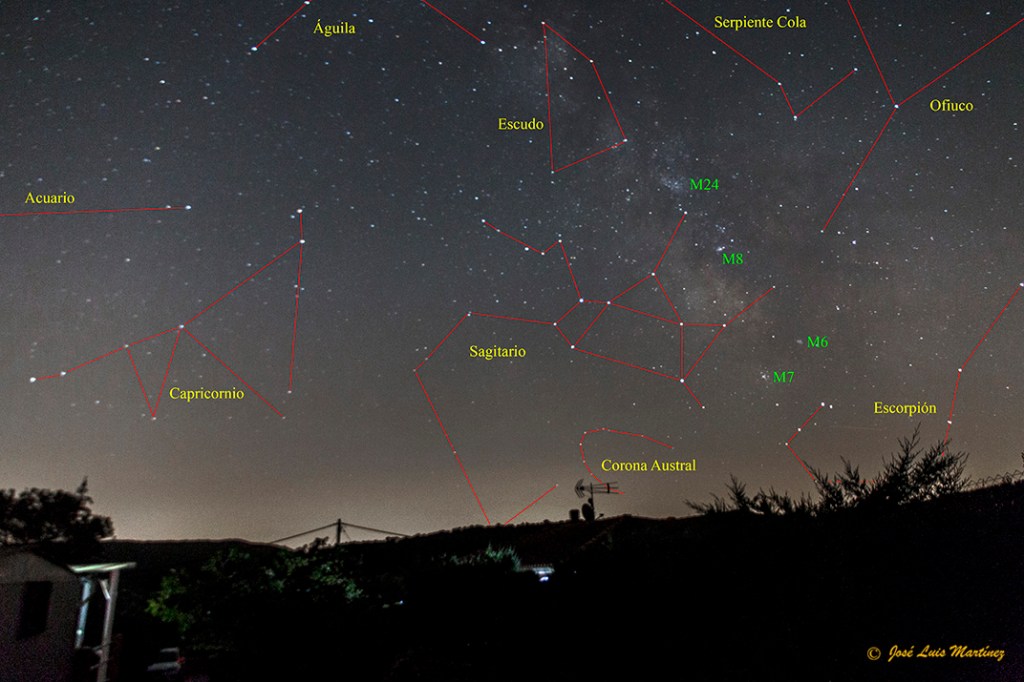 En la imagen anterior se puede observar que la Vía Láctea es muy densa en esta región y, además, como recorre el cielo de sur a este, desde el Escorpión hasta el Águila, pasando por Sagitario y el Escudo.