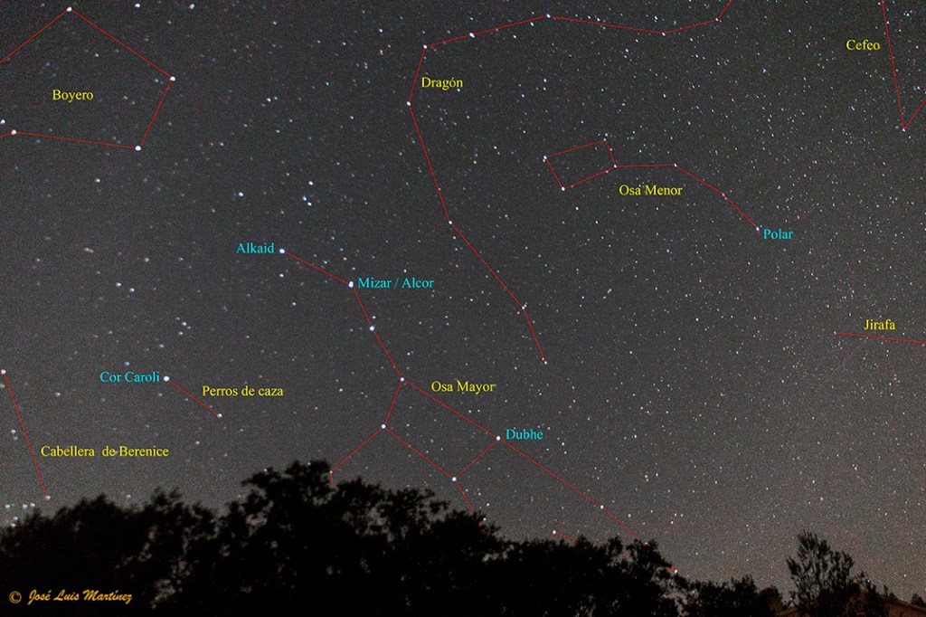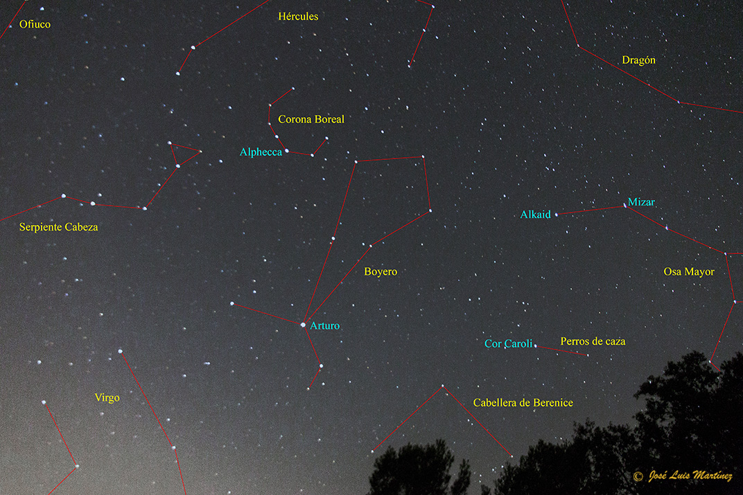 La Osa Mayor nos lleva al Boyero, constelación de primavera. Del Boyero, tirando hacia el oeste, llegamos a otras constelaciones de primavera, Virgo, la Cabellera de Berenice (Coma Berenices) y los Perros de Caza (Canes Venatici). En esta zona ya no está la Vía Láctea, es una zona oscura, pobre en nebulosas, pero rica en galaxias precisamente porque no hay ni polvo ni nebulosas que nos tape.
