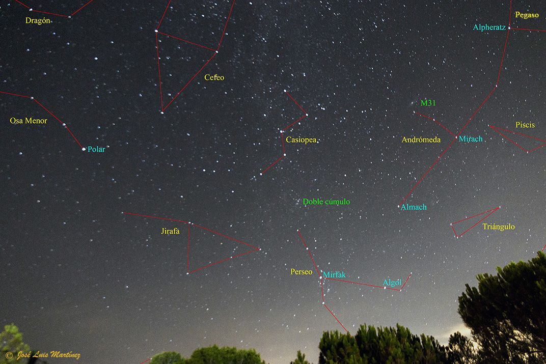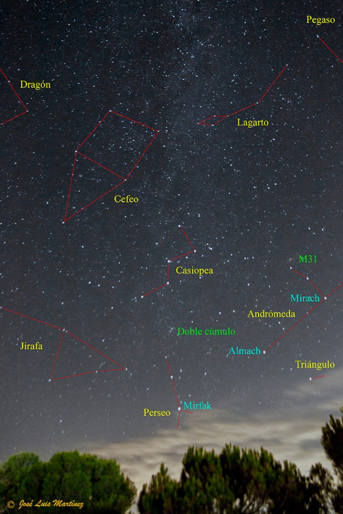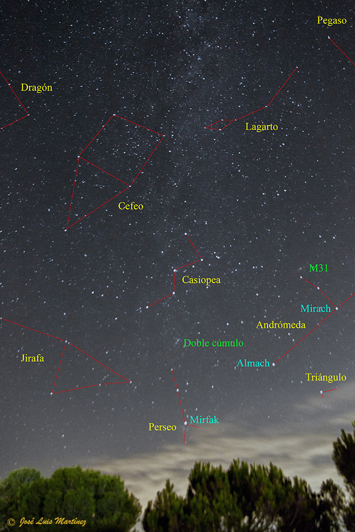 Si ahora avanzamos por la franja de la Vía Láctea, a partir del Cisne hasta el horizonte (hacia el noreste), nos encontramos con alguna constelación de otoño (Lagarto y Perseo) y circumpolares (Cefeo y Casiopea), como podemos ver en las dos imágenes siguientes.