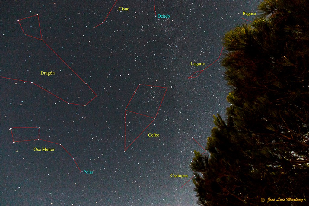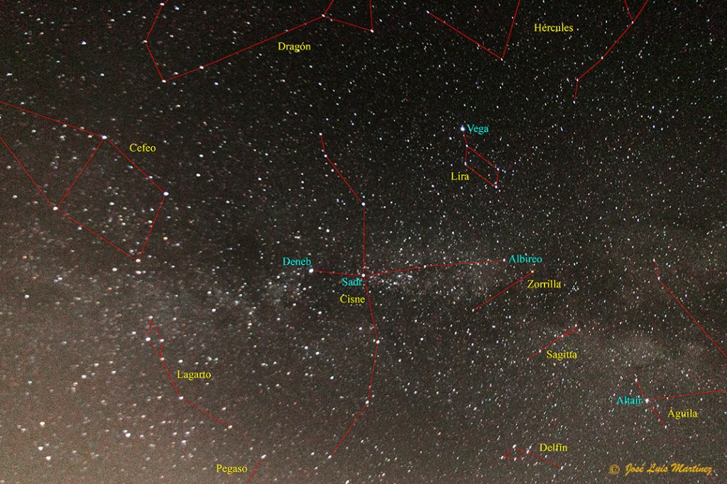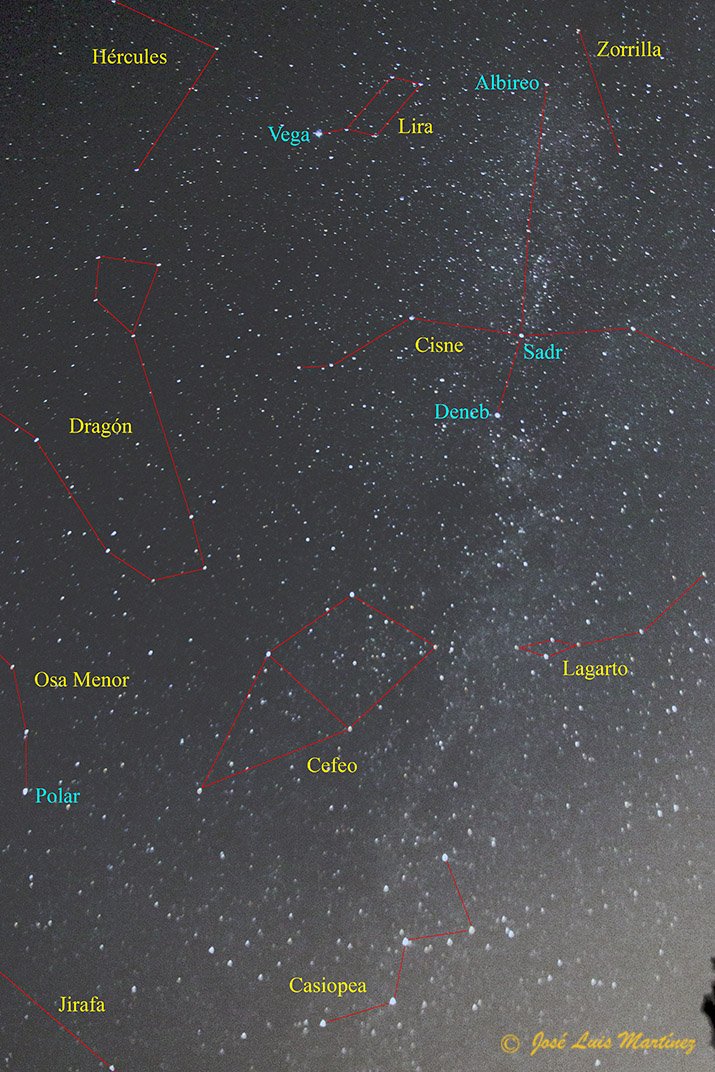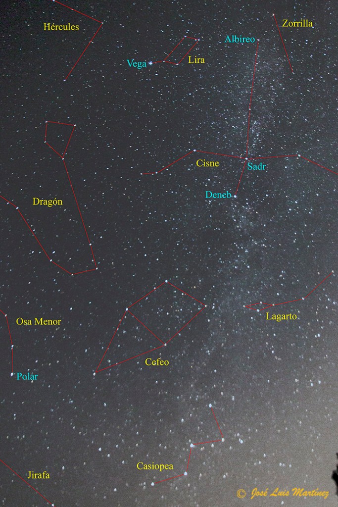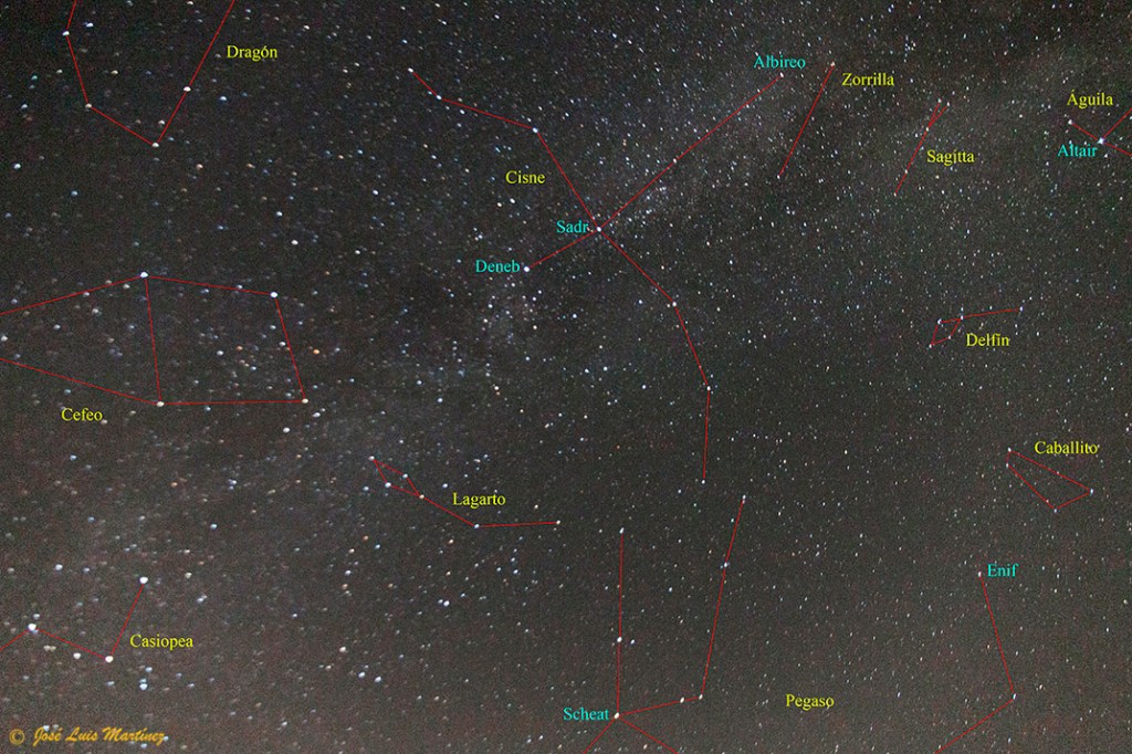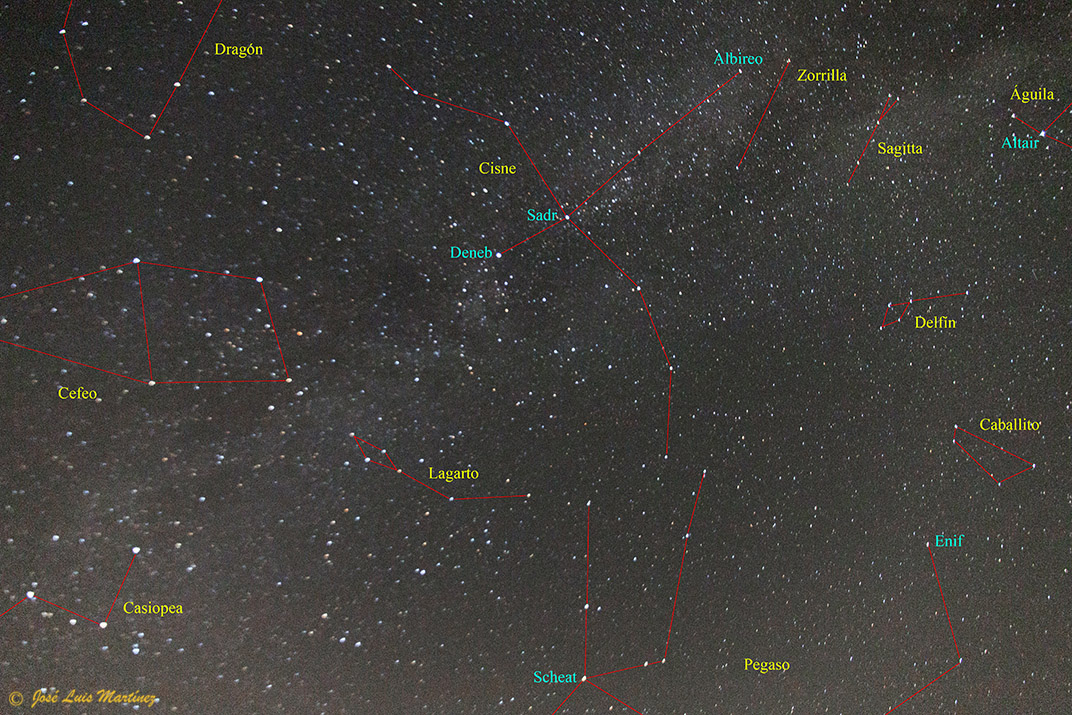 El Cisne está más bien al este, pero si tiramos por la Vía Láctea en dirección noreste (Albireo-Deneb), las constelaciones que nos encontramos son circumpolares (Cefeo y Casiopea) y otoñales (Lagarto y Perseo).