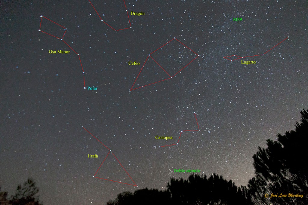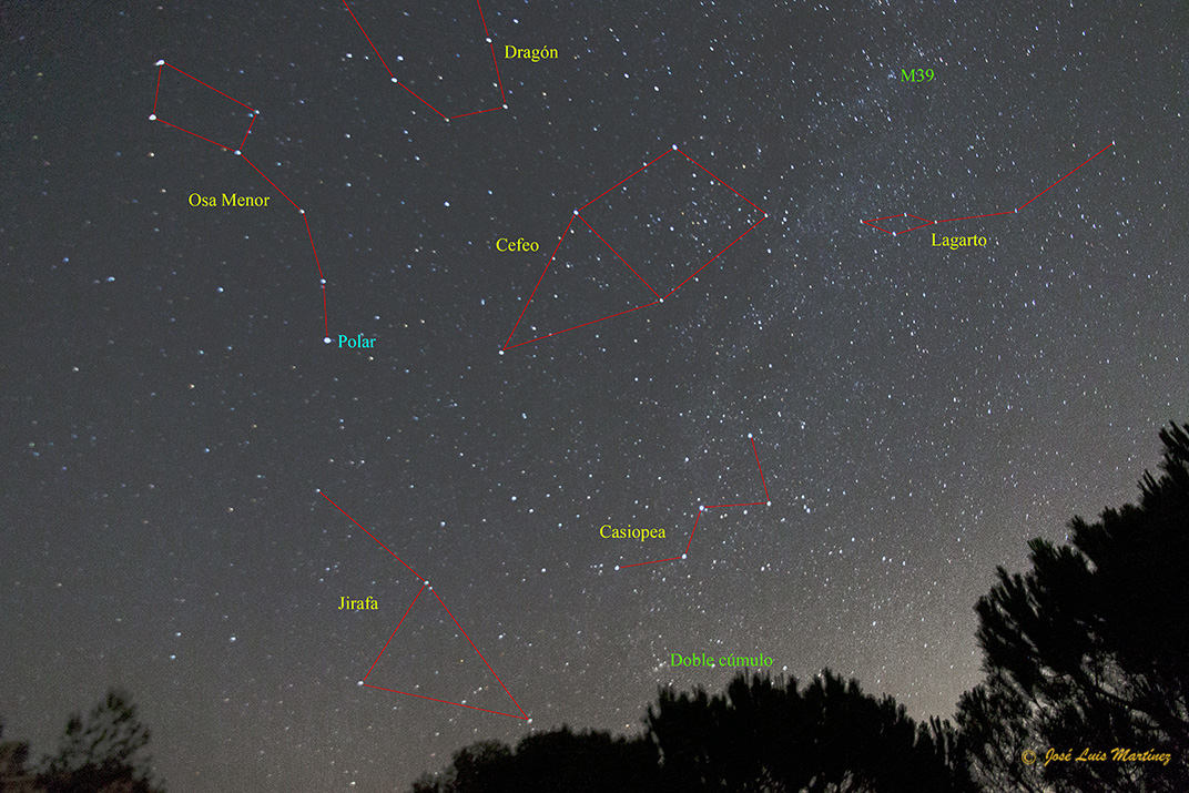 Con Casiopea y Cefeo llegamos así a las constelaciones circumpolares, que en mis latitudes son, además de estas dos, el Dragón, las Osas Mayor y Menor y la Jirafa. En las siguientes imágenes podemos ver las constelaciones circumpolares.