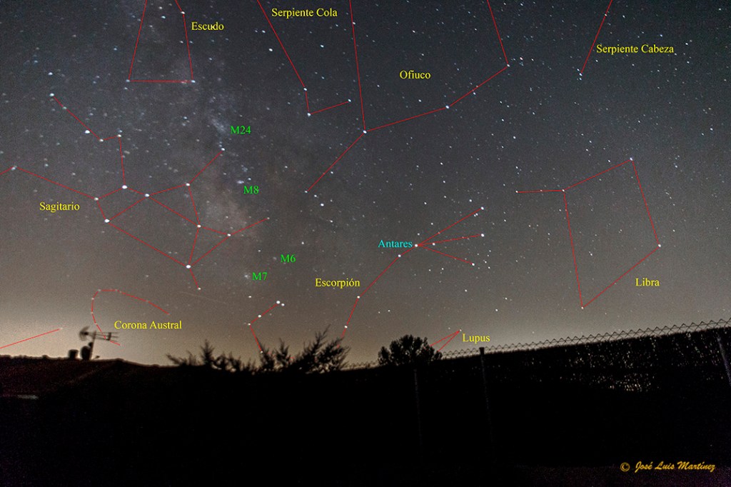 Empezaremos por el sur, por la zona de las constelaciones de la eclíptica de Sagitario y el Escorpión. Estamos en la zona más densa de la Vía Láctea, de hecho, el centro galáctico se encuentra en la dirección de Sagitario. Pero también se ha de decir que está bastante baja en el cielo y la Vía Láctea se ve mejor en el cenit, por la zona del Cisne.