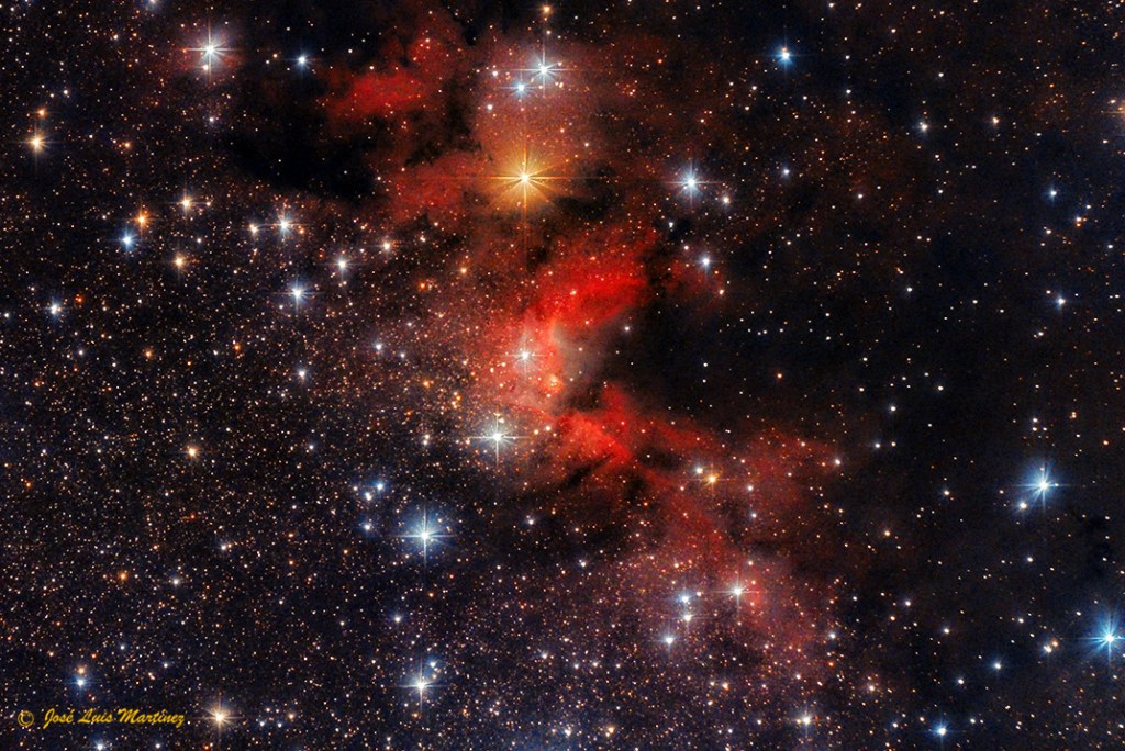 También he indicado LBN 527, una zona rojiza de emisión menos brillante que el arco de la Cueva. Forma parte del mismo complejo que Sh2-155, en el cual se ha catalogado como LBN 529 a la nebulosa brillante en forma de arco y la zona menos brillante al oeste de la misma (izquierda en la imagen) como LBN 527 (para liarlo un poco más 🙄)