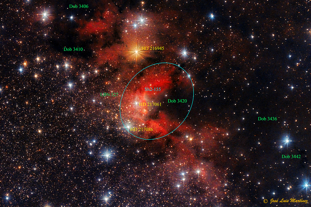 Aunque se conoce toda la zona como Sh2-155, realmente este objeto es precisamente la nebulosa brillante de emisión en forma de arco. Pero en la zona, además de esta nebulosa brillante, hay otros objetos de cielo profundo, así como algunas estrellas interesantes, que he anotado en la siguiente imagen, la cual es un pequeño recorte de la anterior y anotada.