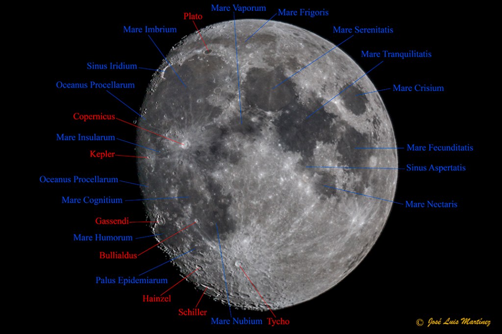 A pesar de que es el peor momento para observar cráteres, algunos se pueden apreciar y, eso sí, todos los mare.