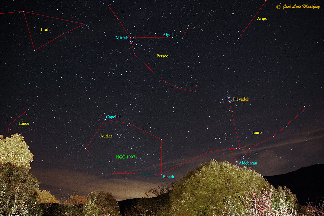 Y ya para acabar, en la imagen siguiente, realizada desde Sant Corneli, en el Berguedà, provincia de Barcelona, el día 2 de noviembre de 2013, con una cámara Canon EOS 30D y un objetivo Sigma 17-70, he indicado la ubicación en el cielo del cúmulo NGC 1907 (coordenadas ⇒ AR: 05h 28m 06s / Dec: +35º 19′ 34″).