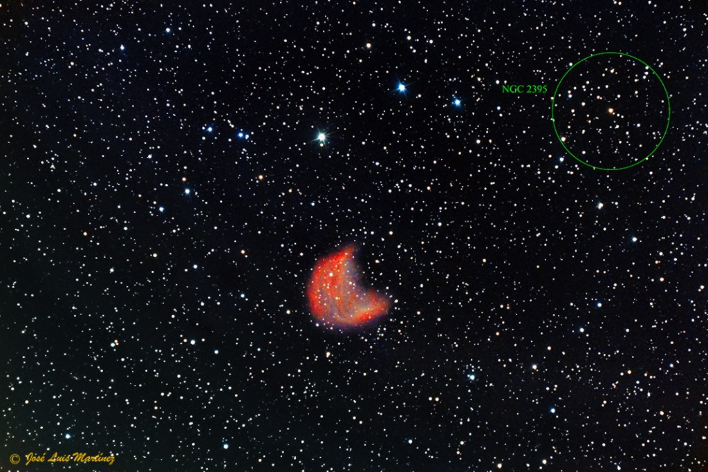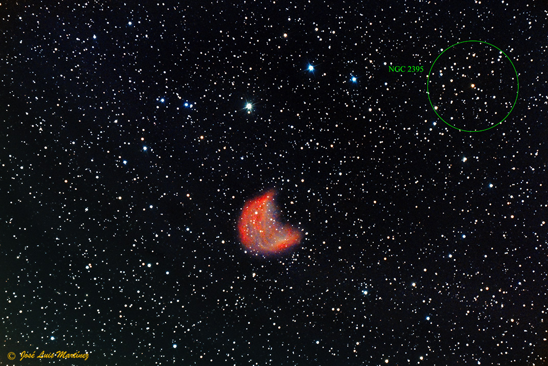 La siguiente imagen, que es la que abre la entrada (sin recortar), he indicado el cúmulo abierto NGC 2395.