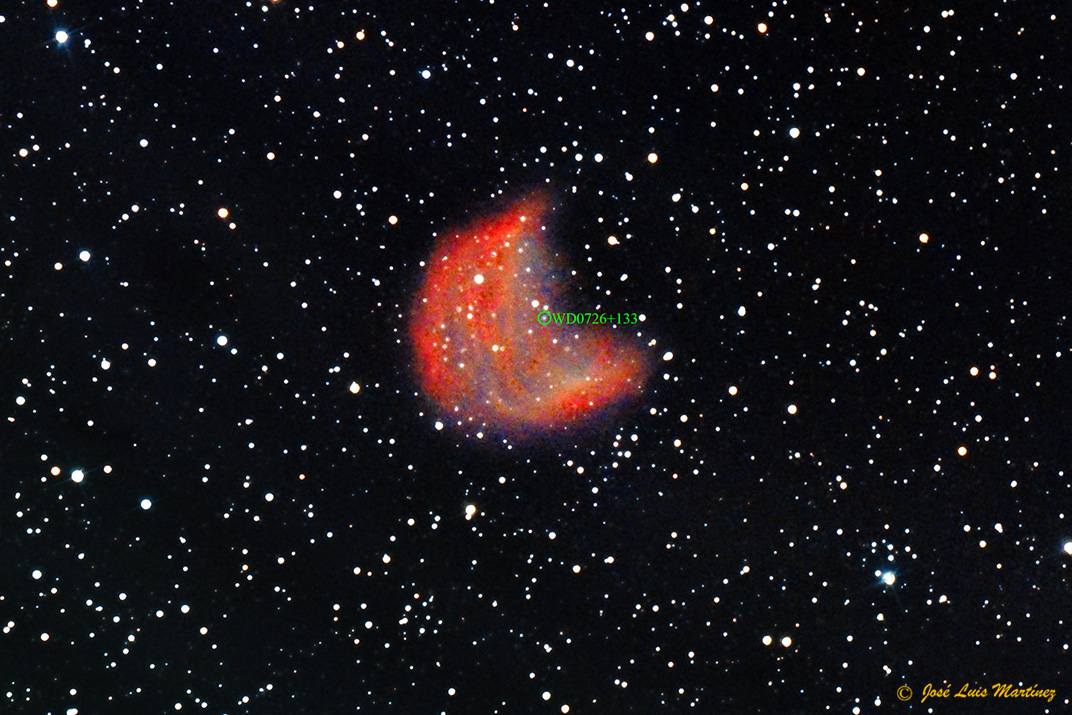La enana blanca de la nebulosa Medusa está catalogada como WD0726+133 y, en la imagen anterior, está por la zona de la derecha de la nebulosa. De todas maneras, en dicha imagen es casi inapreciable, por eso he hecho el siguiente recorte de la misma, donde WD0726+133 ya se aprecia como una estrella débil azulada en la parte derecha.