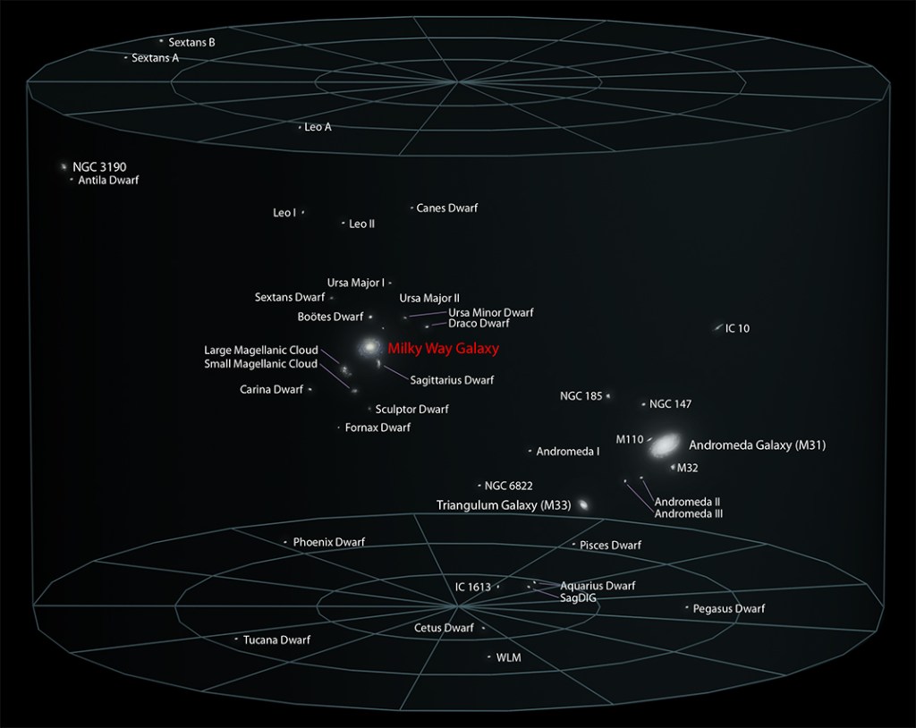 Algunas de estas agrupaciones contienen unas decenas de galaxias; son los llamados grupos de galaxias. Nuestra galaxia, la Vía Láctea, pertenece a uno de estos grupos, el llamado Grupo Local, formado por unas 40 galaxias y abarcando una extensión de unos 10 millones de años luz de diámetro. El Grupo Local tiene tres galaxias grandes, M31, la galaxia de Andrómeda, la mayor, seguida de nuestra Vía Láctea y, tras ella, la galaxia del Triángulo (M33) El resto son galaxias enanas, en su mayoría ligadas gravitacionalmente a las tres mayores, como las galaxias satélites de Andrómeda M32 y M110 o las Nubes de Magallanes, dos galaxias satélites de la Vía Láctea.